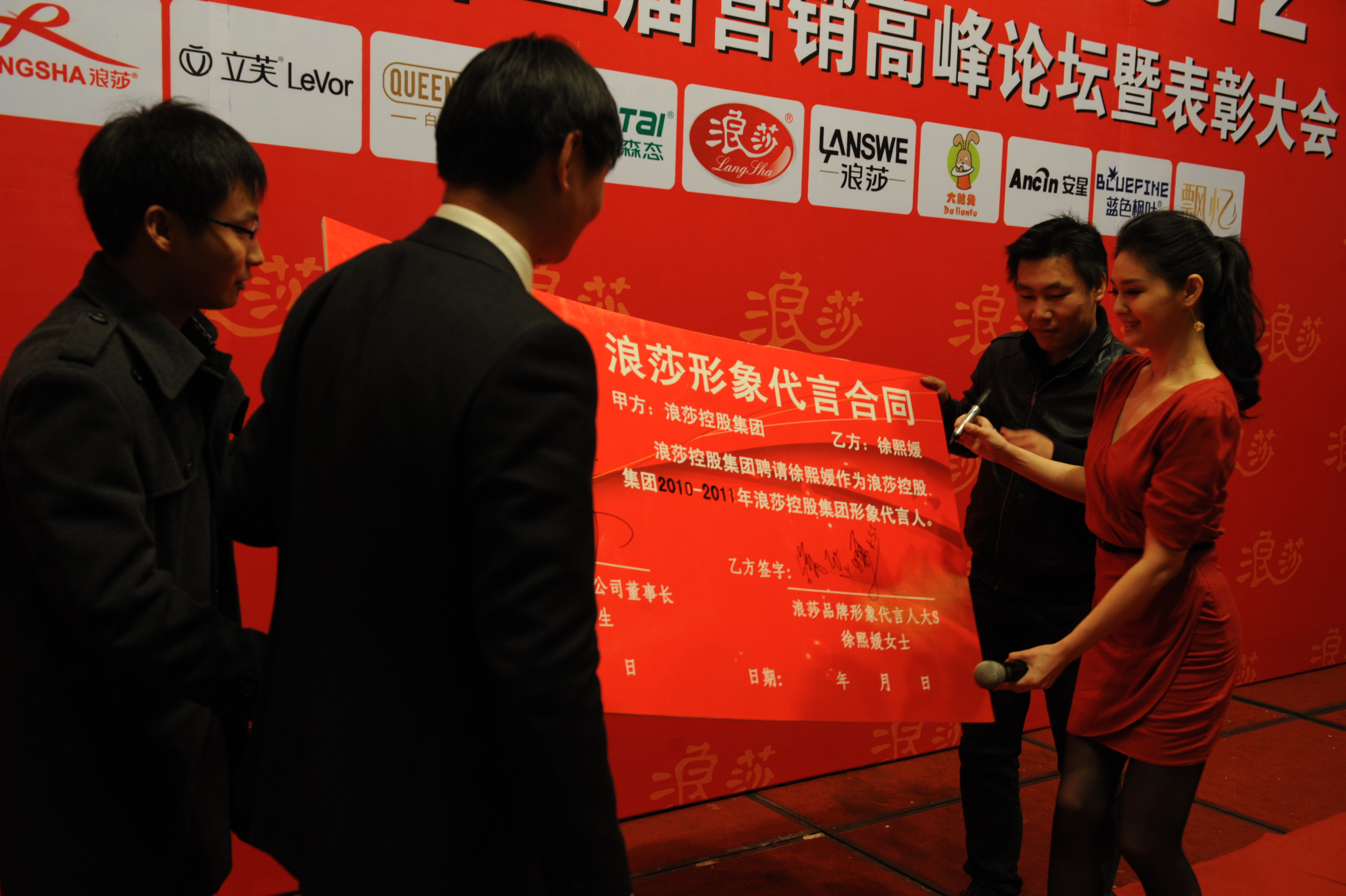 S于下午兩點二十分到達活動現場,現場致辭,與主持人互動,表達對浪莎品牌產品的喜愛和對浪莎的信賴。隨后S與浪莎集團董事局總裁翁榮弟進行簽約儀式,這已經是S第四年代言浪莎品牌,用S的話說:“浪莎是一個很有活力的企業,跟浪莎合作感到非常愉快!”