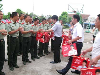 為喜迎第八十二個建軍節的到來,7月27日下午,浪莎黨總支義與烏經濟開發區黨組織第四區域的其他7個企業支部,帶著襪子、飲料以及為軍人特制的鏡框等禮品,來到金華市武警一中隊,向部隊官兵獻上了一份節日厚禮。并與武警官兵們一起打籃球、表演精彩的晚會節目,與官兵們齊唱歌共聯歡,度過了一個難忘的節日。